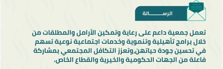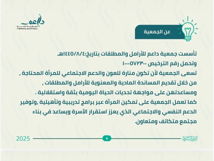 تأسست جمعية داعم للأرامل والمطلقات بتاريخ:١٤٤٥/٨/٤ه وتحمل رقم الترخيص ١٠٠٠٥٧٢٣٠٠ تسعى الجمعية لأن تكون منارة للعون والدعم الاجتماعي للمرأة المحتاجة, من خلال تقديم المساندة المادية والمعنوية للأرامل والمطلقات, ومساعدتهن على مواجهة تحديات الحياة اليومية بثقة واستقلالية . كما تعمل الجمعية على تمكين المرأة عبر برامج تدريبية وتأهيلية ,وتوفير الدعم النفسي والاجتماعي الذي يعزز استقرار الأسرة ويساعد في بناء مجتمع متكاتف ومتعاون.